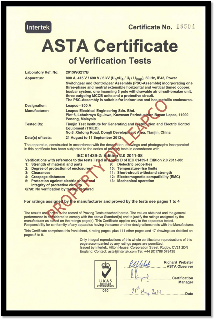 ASTA Certificate of Verification Tests to IEC 60439 & 61439 (FULL TYPE)